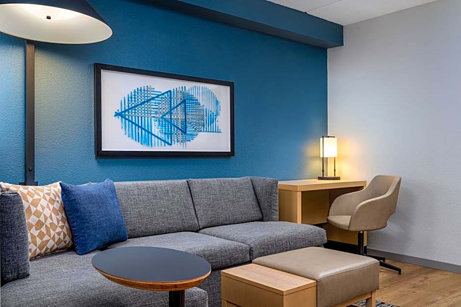 This room features a refrigerator, coffee machine, and flat-screen TV. The bathroom has an accessible bath tub.